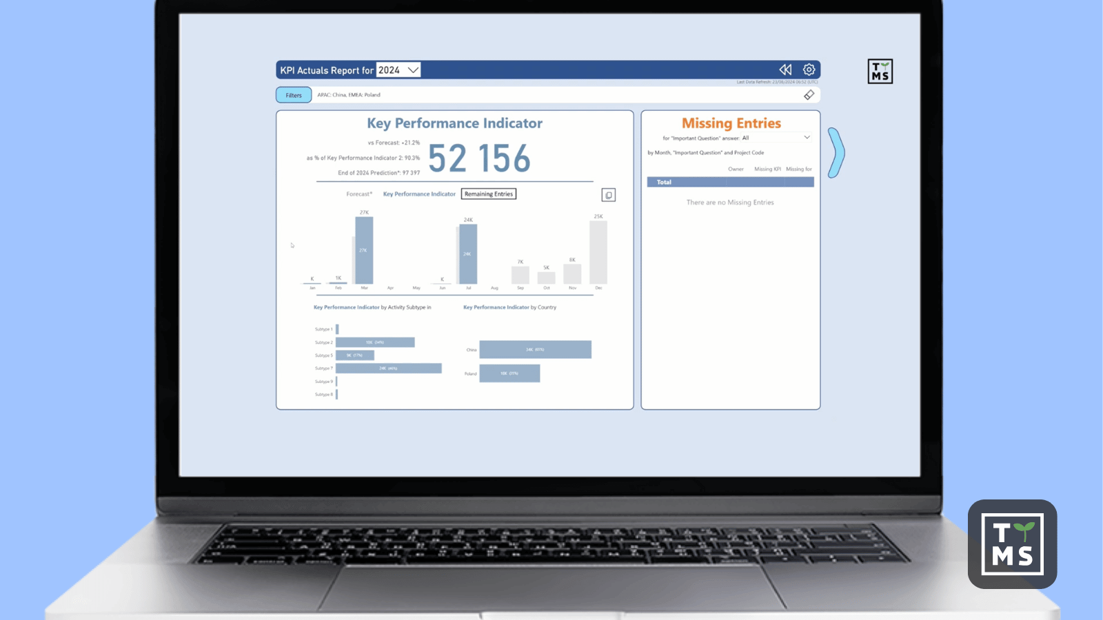 Pomarańczowy kolor natychmiast sygnalizuje brakujące dane, zachęcając do działania. Gdy wszystkie informacje są kompletne, uwaga automatycznie przenosi się na wskaźniki KPI i trendy. TTMS zadbało o spójność kolorów w całym projekcie – każda barwa niesie znaczenie, tworząc spójny język wizualny. Użytkownik szybko uczy się interpretować sygnały bez konieczności dodatkowych opisów.